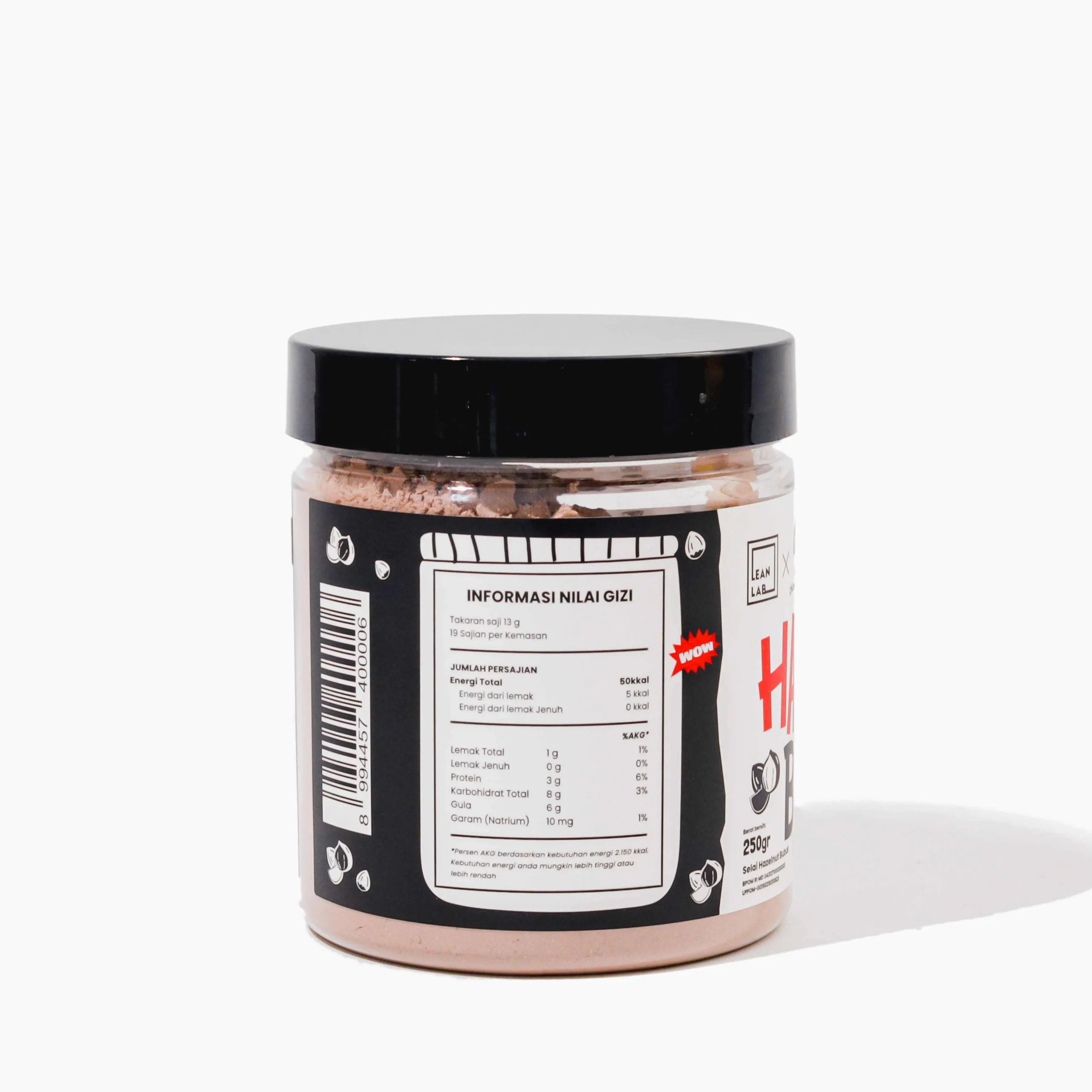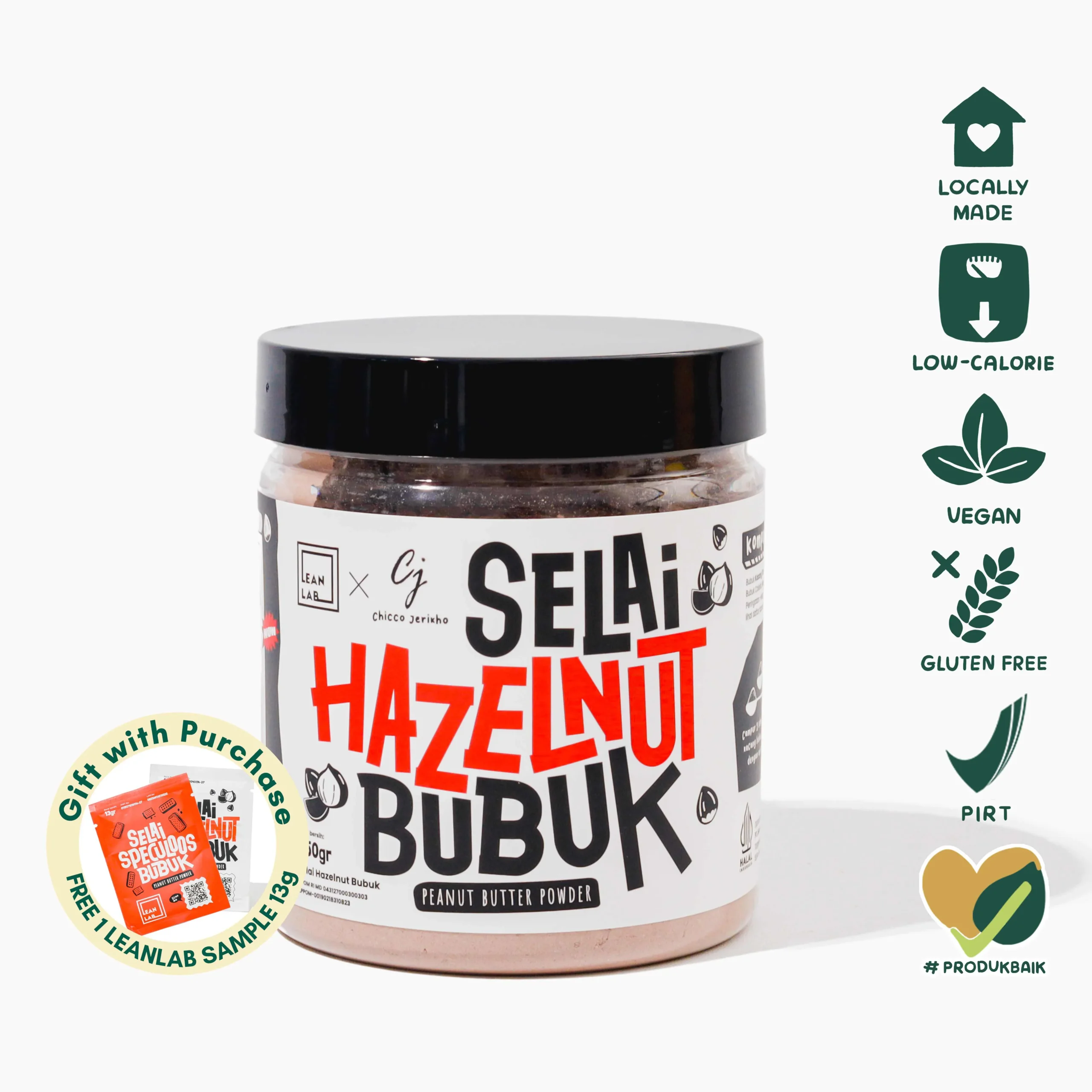 Lean Lab Selai Hazelnut x CJ adalah selai coklat hazelnut bubuk rendah kalori pertama di Indonesia. Dibuat menggunakan kacang pilihan, selai leanlab telah dipisahkan kandungan minyaknya dan menjadi selai rendah kalori yang ideal untuk gaya hidup sehat Anda.