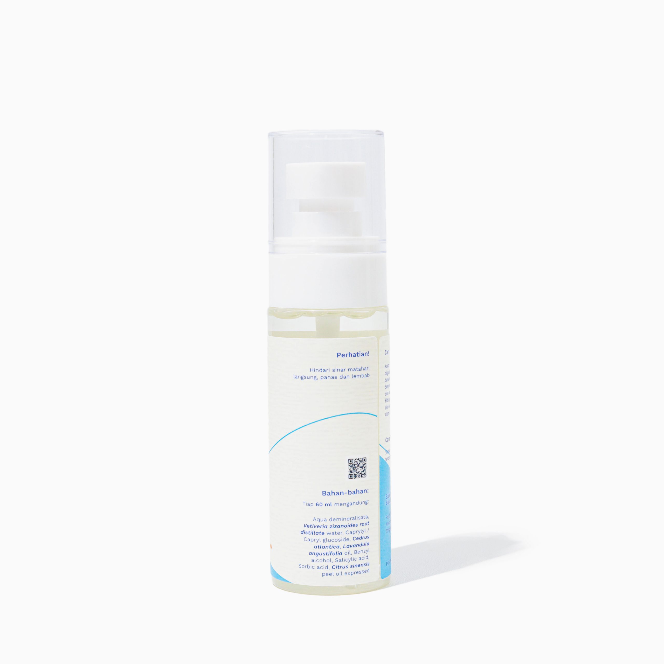 Water (Aqua), Vetiver Root Distillate Water (Vetiveria zizanoides), Natural Solubilizer (Caprylyl/Capryl Glucoside), Natural Preservatives (Benzyl Alcohol, Salicylic Acid, Glycerin, Sorbic Acid), Cedarwood Oil (Cedrus atlantica), Sweet Orange Oil (Citrus sinensis), Lavender Oil (Lavandula angustifolia).