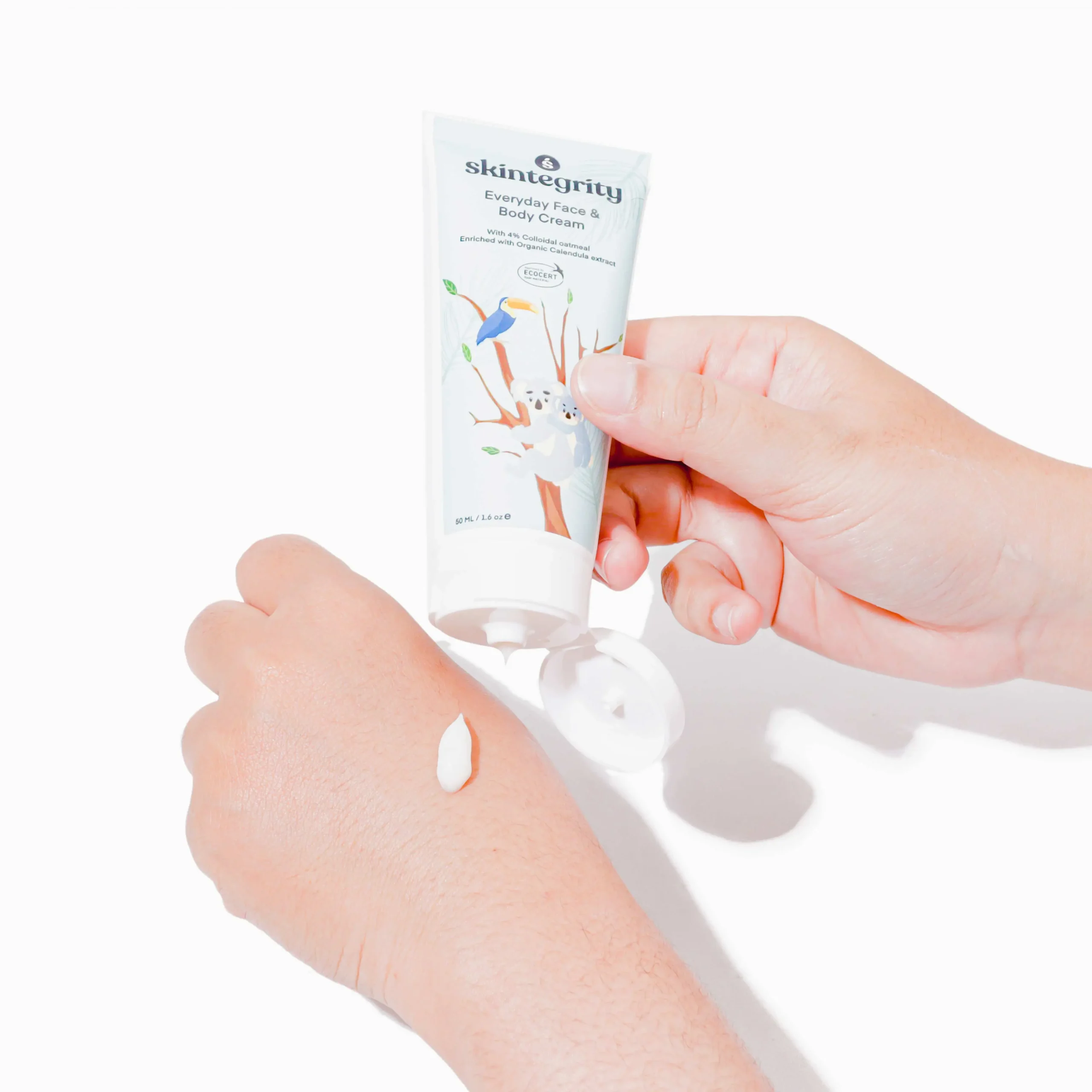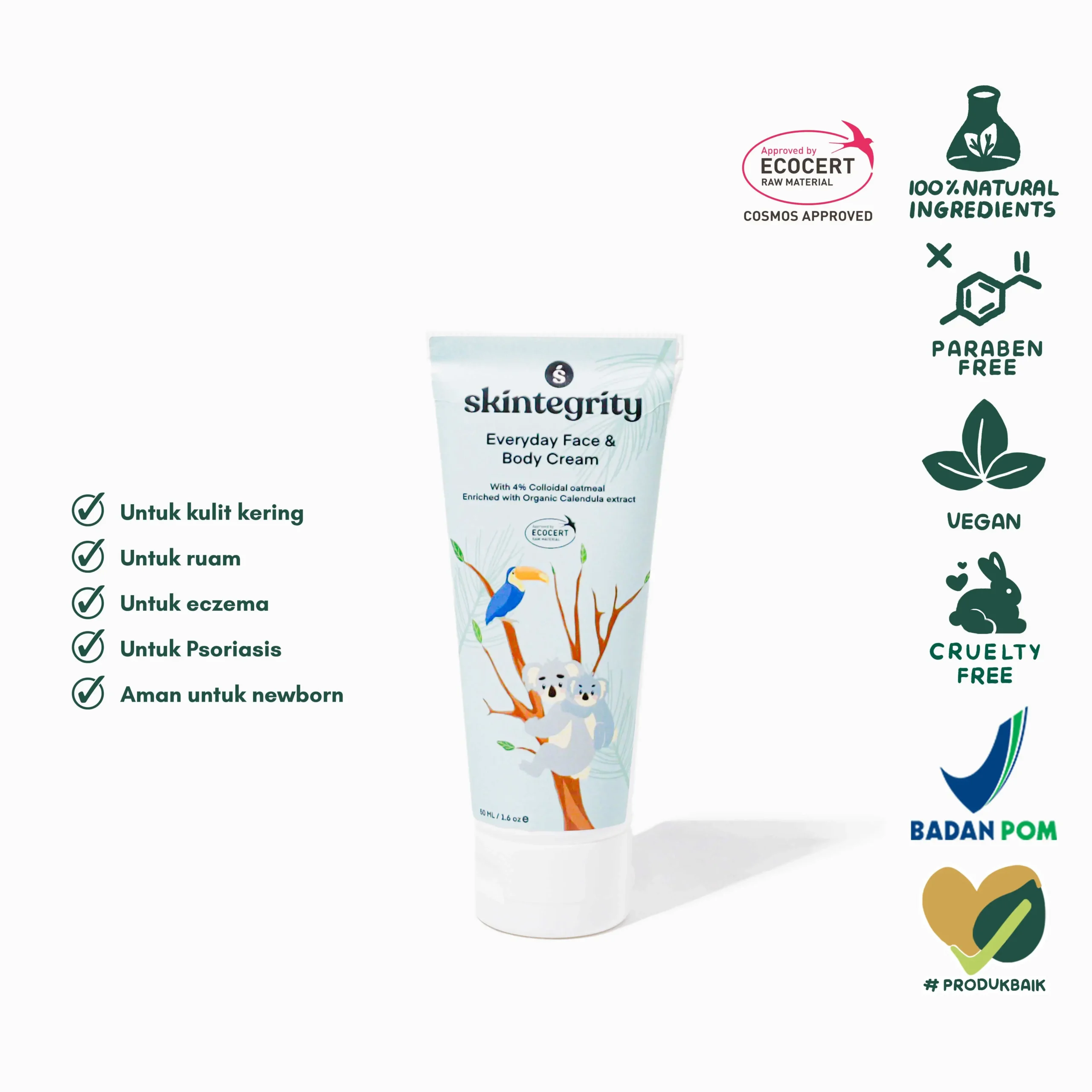 Skintegrity Baby & Kids Everyday Face & Body Cream diformulasikan khusus untuk menenangkan kulit kering si kecil , krim bayi kami ini akan membuat kulitnya lembut dan terhidrasi. Terbuat dari bahan-bahan alami yang aman digunakan mulai dari bayi baru lahir dengan kulit sensitif, bahkan dengan kondisi eczema dan psoriasis.