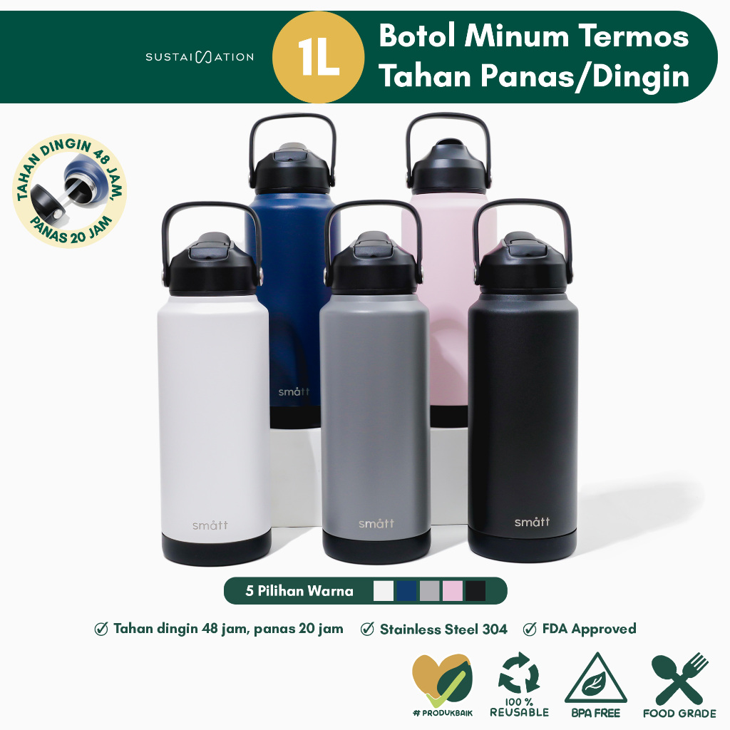 Smatt Double Insulation Bottle – 1000ml terbuat dari bahan stainless steel 304 food grade, dilengkapi dengan silicone sleeve anti slip, tali yang stylish & ergonomis yang memudahkan untuk dibawa traveling. BPA Free, FDA Approved, dan Food Grade. Tahan dingin 48 jam, panas 20 jam.
