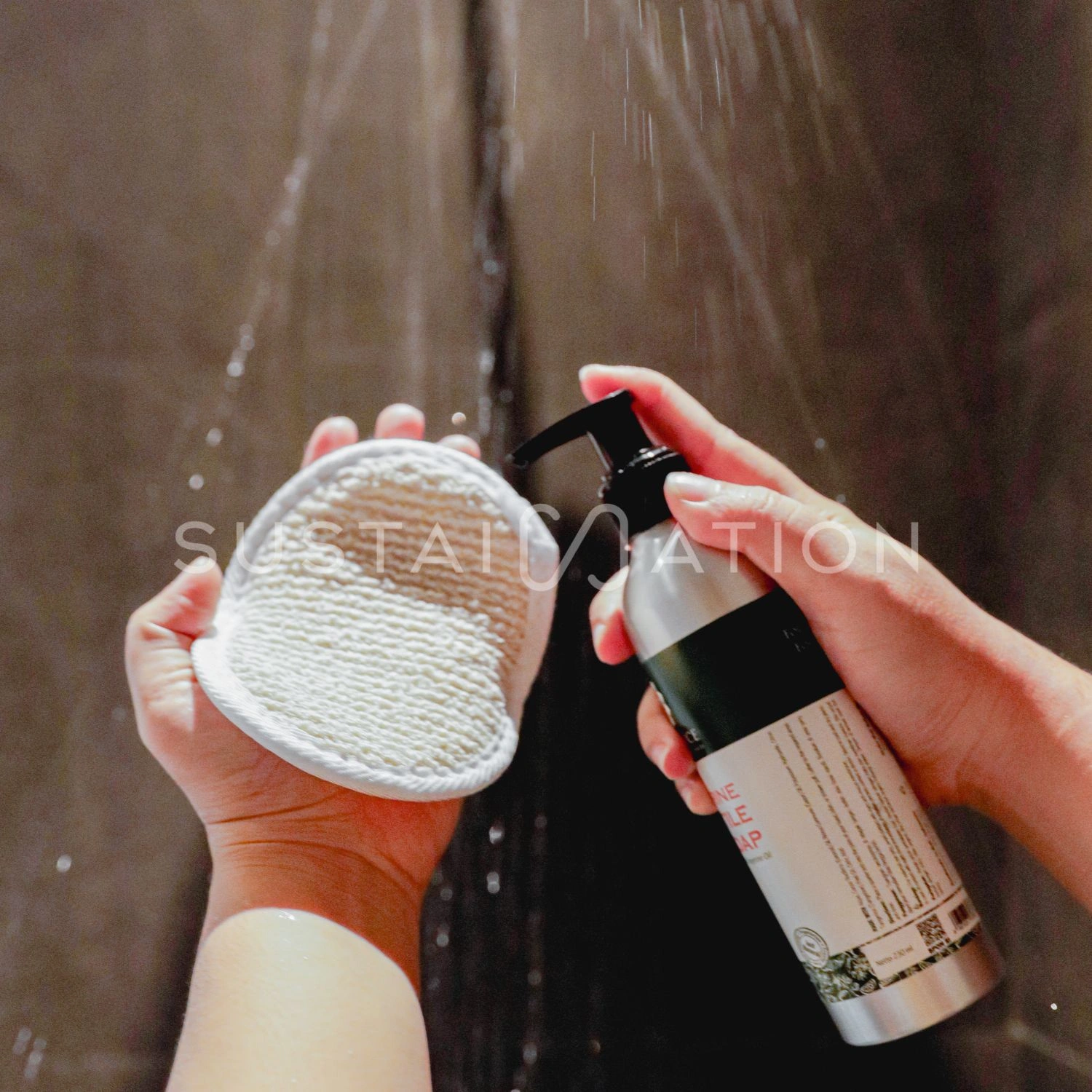 Terbuat dari dari bahan kain yang mudah menyerap air dan tahan terhadap bakteri dan jamur. Teksturnya yang super lembut menghasilkan busa melimpah, sehingga kamu dapat menggunakan lebih sedikit shower gel/sabun mandi. Tekstur jaring mengangkat dan membersihkan sel-sel kulit mati sehingga kulit terasa lembut, bersih dan fresh.