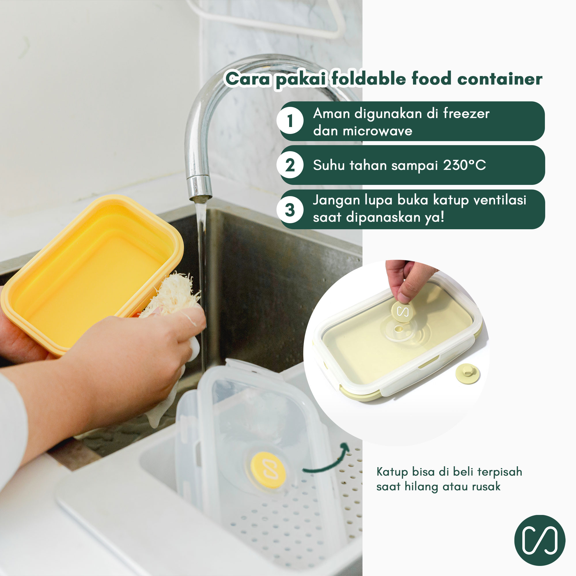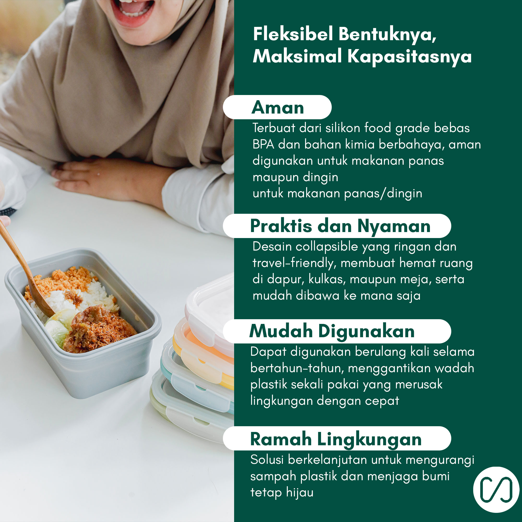Sustaination Foldable Food Container adalah tempat makan lipat yang terbuat dari silicon foodgrade & BPA Free yang tahan dingin (freezer safe) & panas (microwave safe). Anti pecah & anti tumpah sehingga praktis untuk dibawa bepergian, bekal sekolah/kantor, hingga piknik. Cocok untuk makanan kering maupun porsi besar, dan bisa juga dipakai untuk menyimpan makanan di kulkas. Saat tidak dipakai, wadah bisa dilipat tipis sehingga lebih hemat ruang di tas maupun lemari.