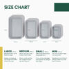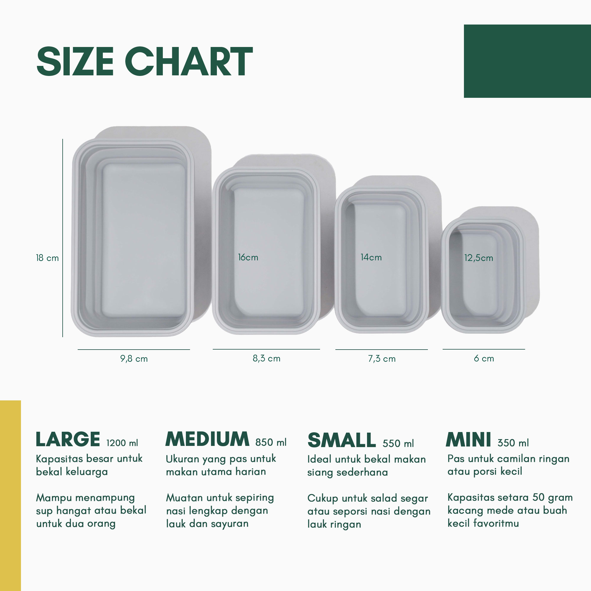 - 550 ml (Size S), Dimensi (P×L×T): 14 × 7,3 × 5,7 cm: untuk bekal porsi sedang, nasi/lauk terpisah, atau meal prep ringan