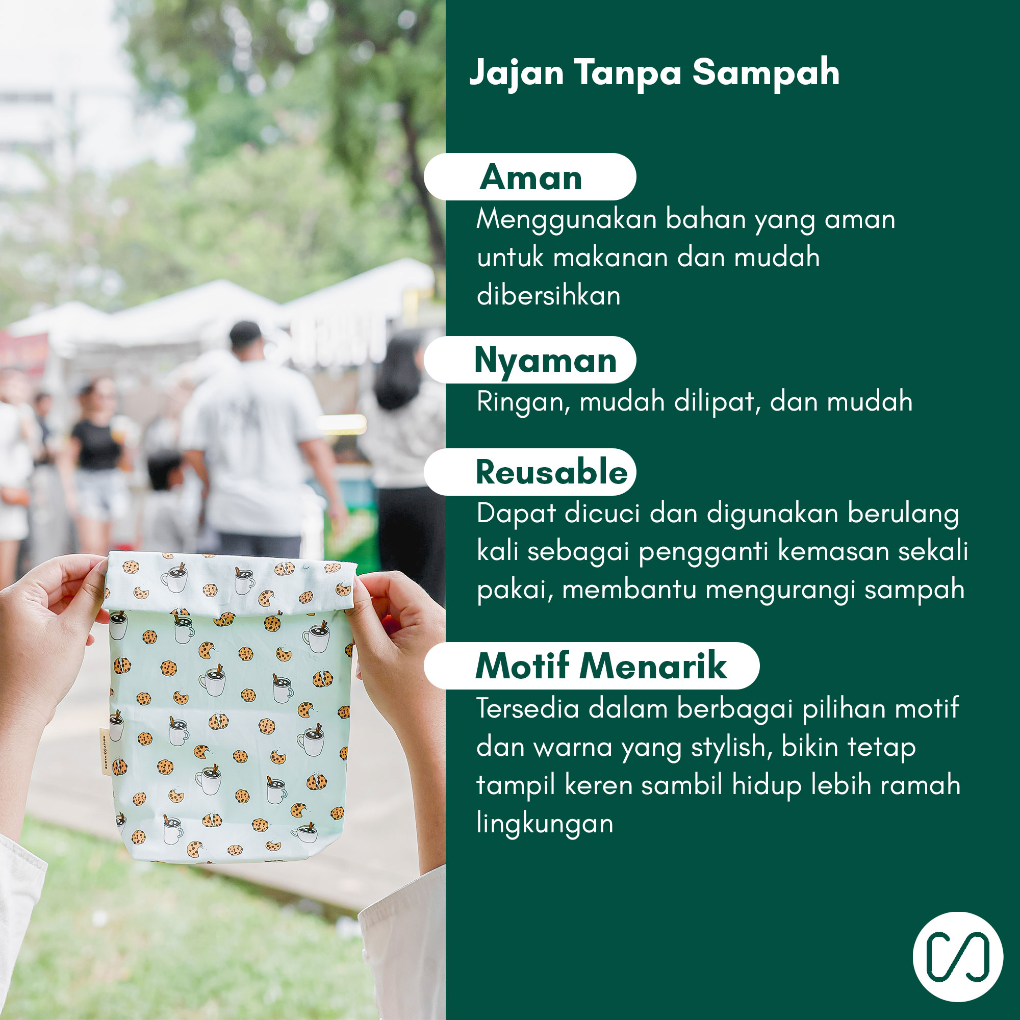 Snack bag ini bisa dipakai sebagai kantung jajanan pakai ulang untuk membantu mengurangi penggunaan plastik sekalinpakai saat kamu ingin jajan di luar rumah. Snack bag ini sudah tersertifikasi food grade, 100% waterproof, 100% oil proof, sehingga aman bersentuhan langsung dengan makanan. Diproduksi lokal di Indonesia dengan outer 100% katun serta inner kain tersertifikasi food grade.Produk ini bisa dicuci dan dipakai ulang sehingga minim sampah dan praktis & ringan sehingga mudah dibawa untuk bekal atau jajan saat bepergian. Tersedia 9 varian warna.