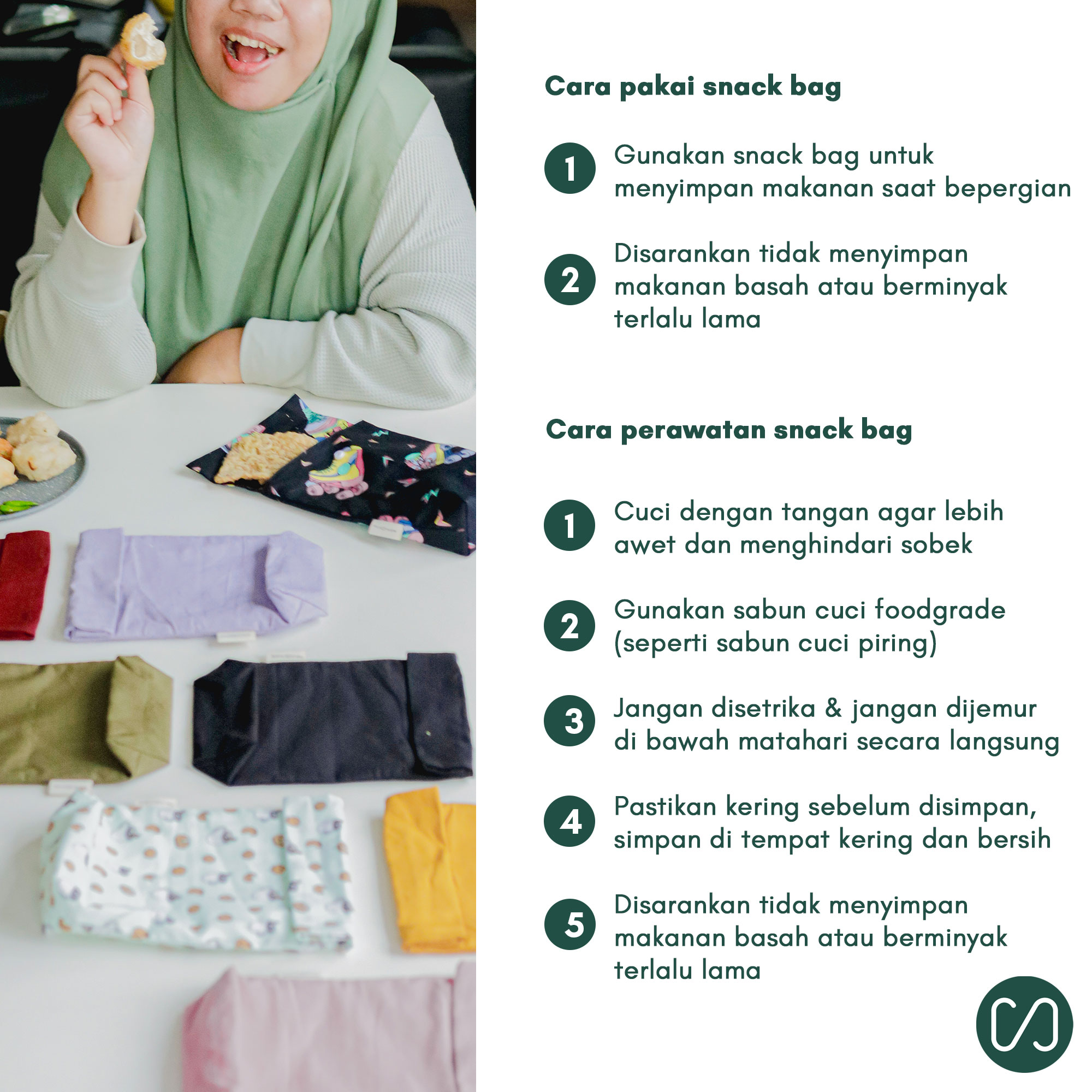Snack bag ini dirancang untuk dipakai berulang dalam jangka panjang. Jika sudah rusak dan tidak layak pakai, lakukan reuse dulu bila memungkinkan (misalnya untuk kantong non-makanan), lalu buang sesuai sistem pengelolaan sampah setempat. Ketersediaan daur ulang tekstil berbeda di tiap daerah.