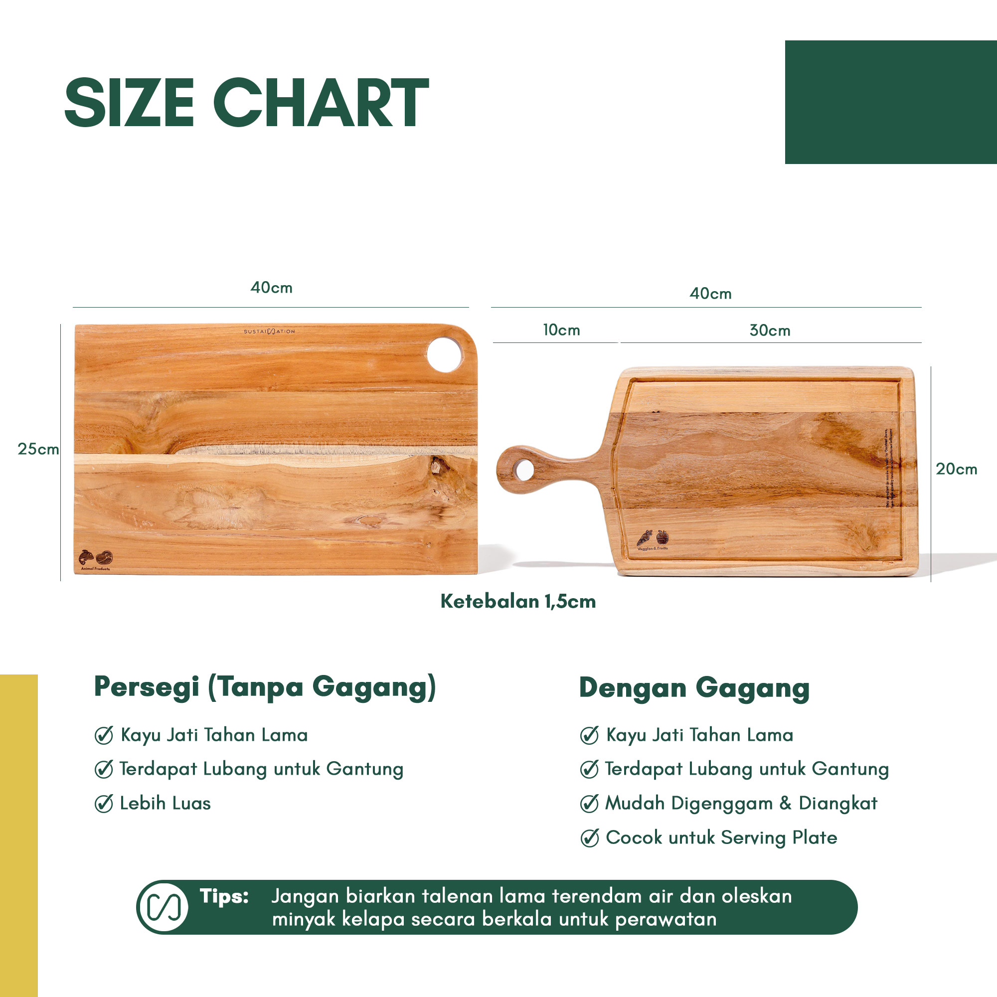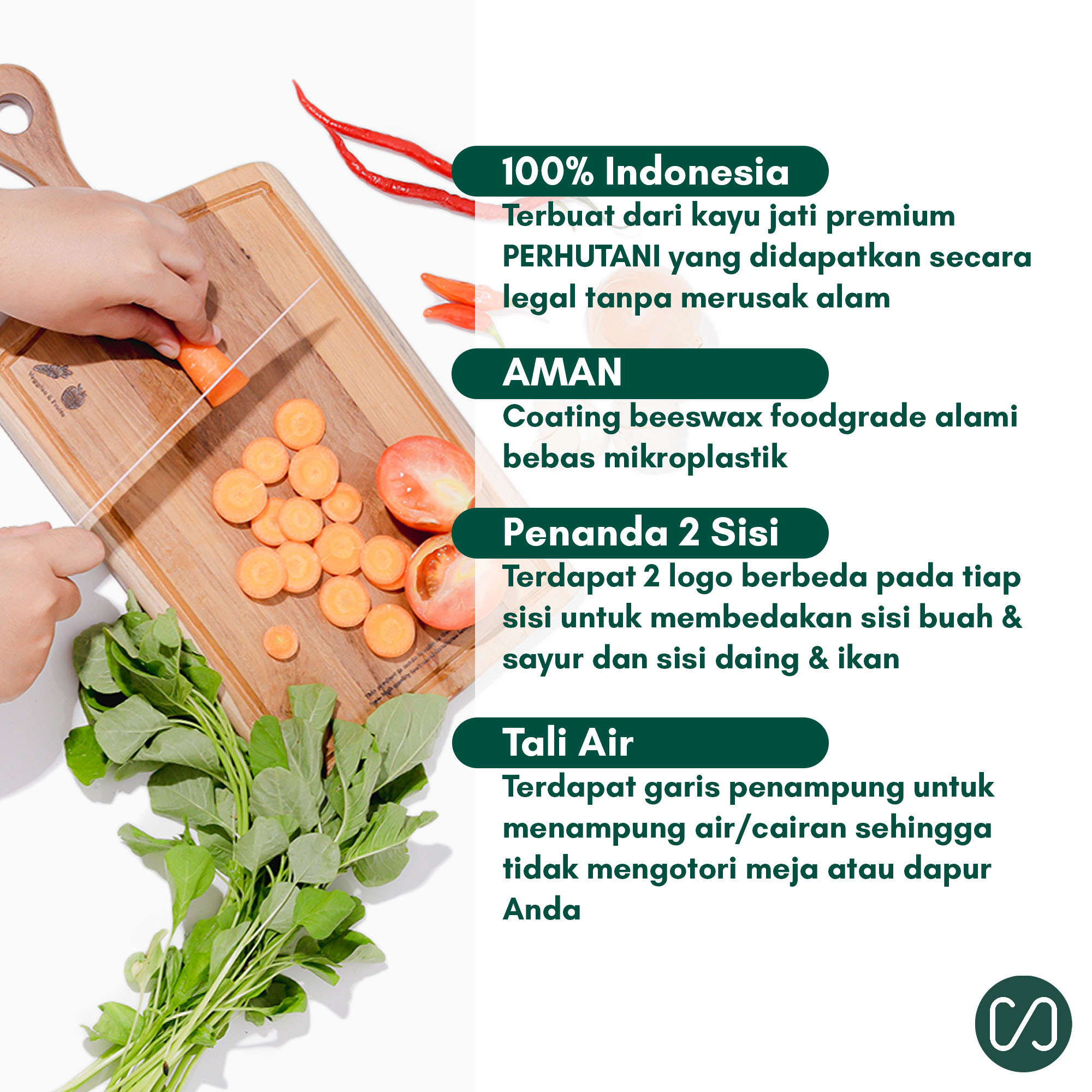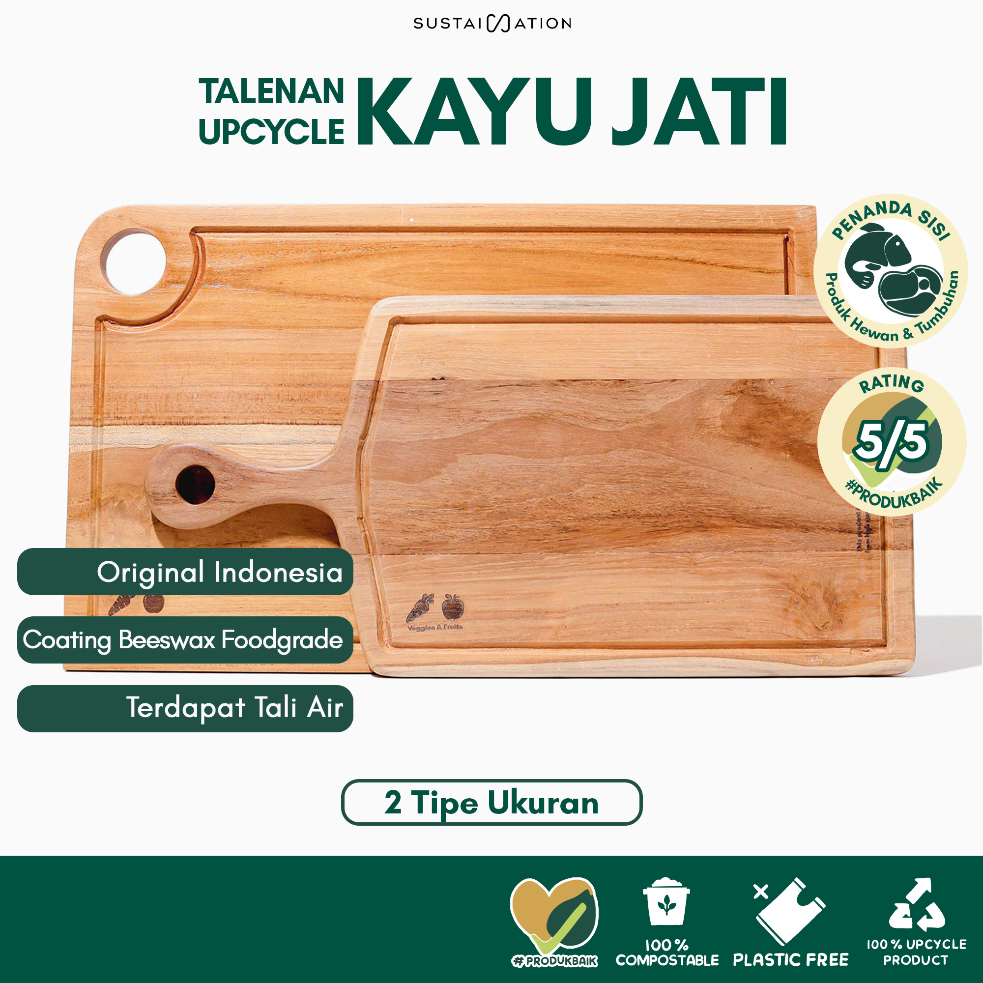 Talenan kayu lokal dari Jawa tengah terbuat dari potongan kecil sisa kayu jati premium perhutani yang didapatkan secara legal tanpa merusak alam ini memiliki ukiran pada bagian samping sehingga menjaga cairan dari daging, sayur, dan bahan makanan lainnya agar tidak mengotori meja.