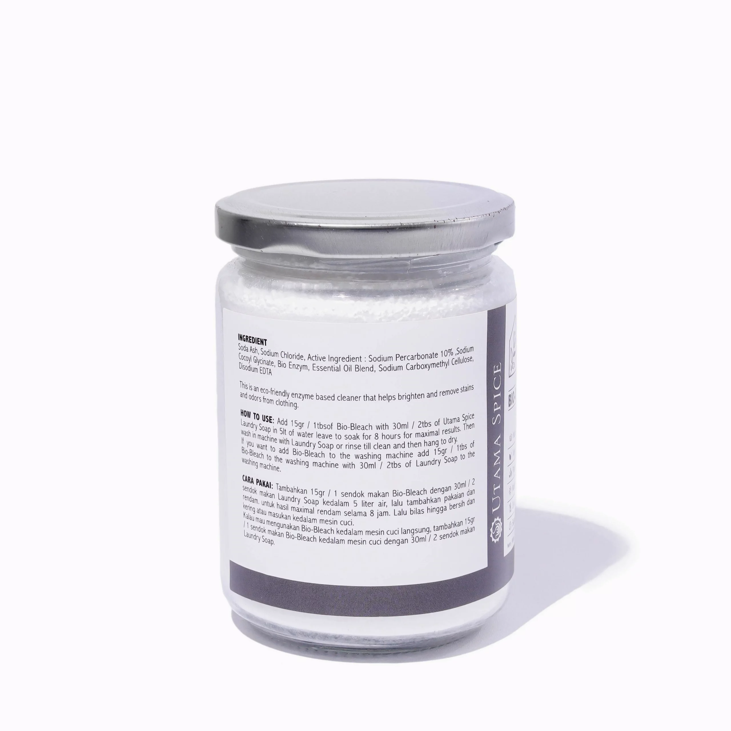Utama Spice BIO BLEACH pembersih enzim ramah lingkungan yang dirancang khusus untuk mencerahkan, menghilangkan noda, dan menghilangkan bau dari pakaian. Formula yang kuat namun lembut menggunakan bahan alami dan enzim untuk membersihkan secara menyeluruh. Dibuat tanpa bahan kimia keras yang dapat merusak pakaian dan membahayakan lingkungan.