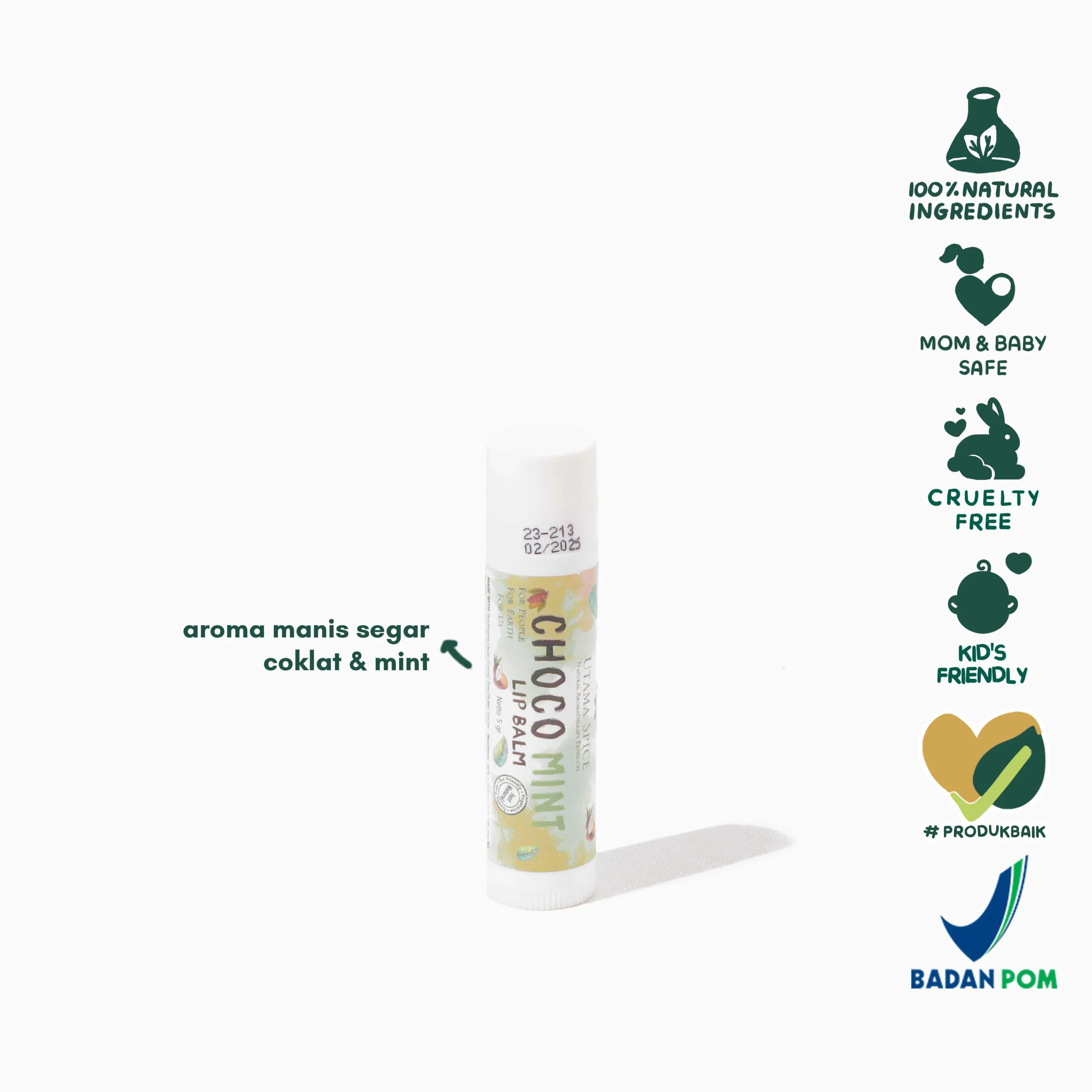 Utama Spice Choco Mint Lip Balm 5 gr menjaga bibir agar tetap tampak indah, balm dengan Virgin Coconut Oil (VCO) ini melindungi bibirmu dengan menambah hidrasi dan melawan tanda penuaan. Cocoa Butter memberikan lapisan kelembaban tambahan dan aroma cokelat yang manis. Minyak peppermint menambahkan kesejukan yang membangunkan dan menyegarkan, sementara kayu manis nya menambahkan tingkat kehangatan yang merangsang indra. Semua terbuat dari bahan alami seperti vitamin E dan beeswax akan menjaga bibirmu sehingga terlihat dan terasa sehat dan indah.
