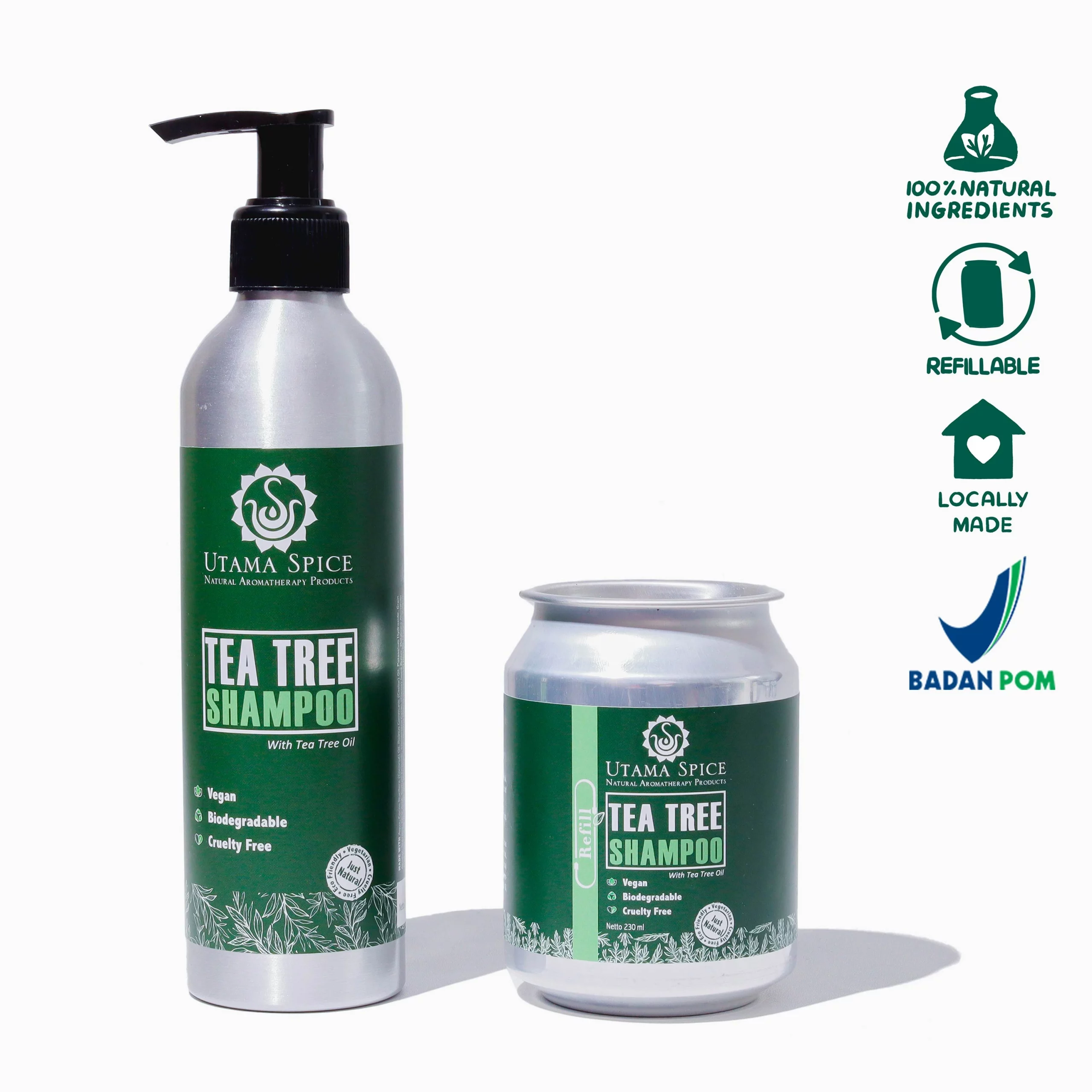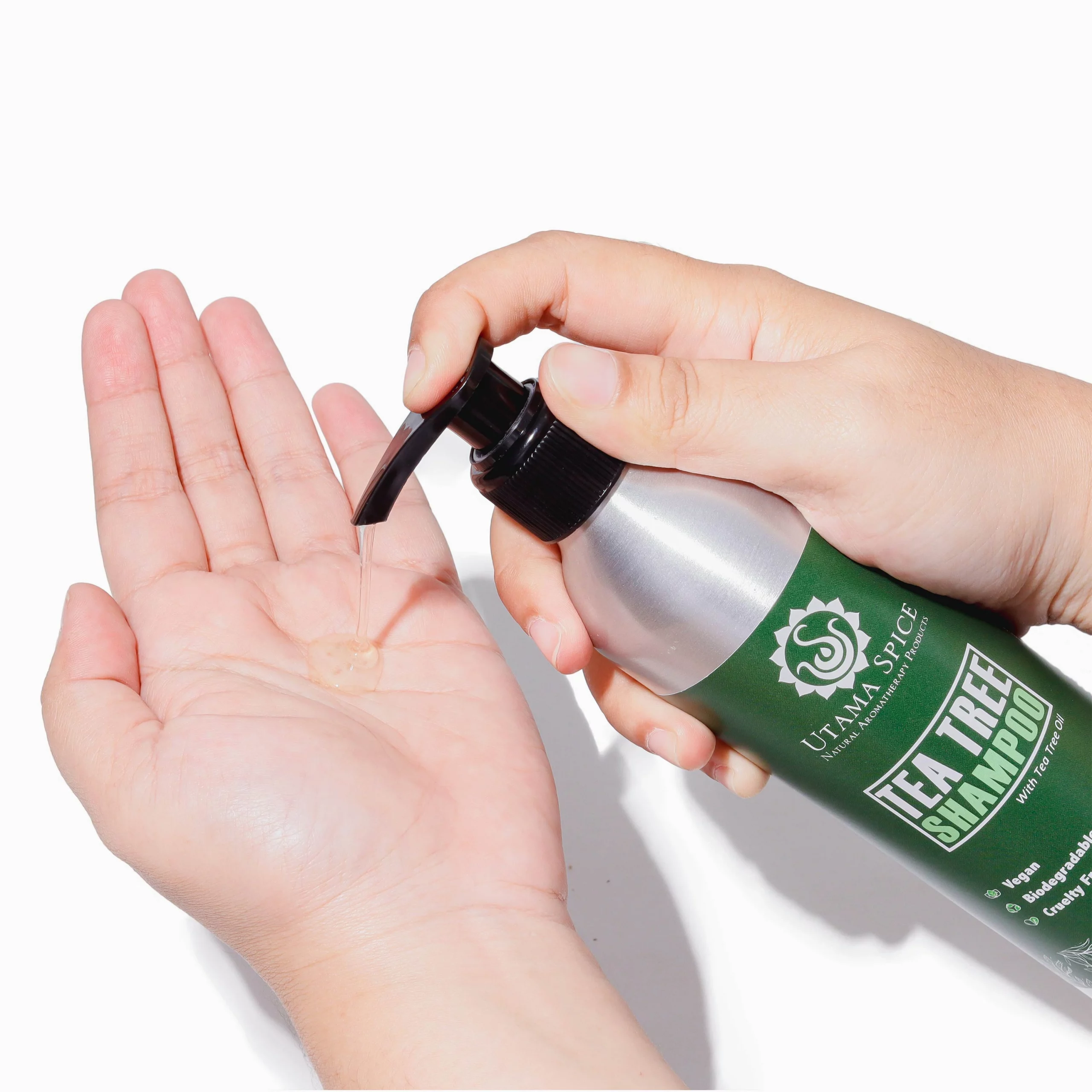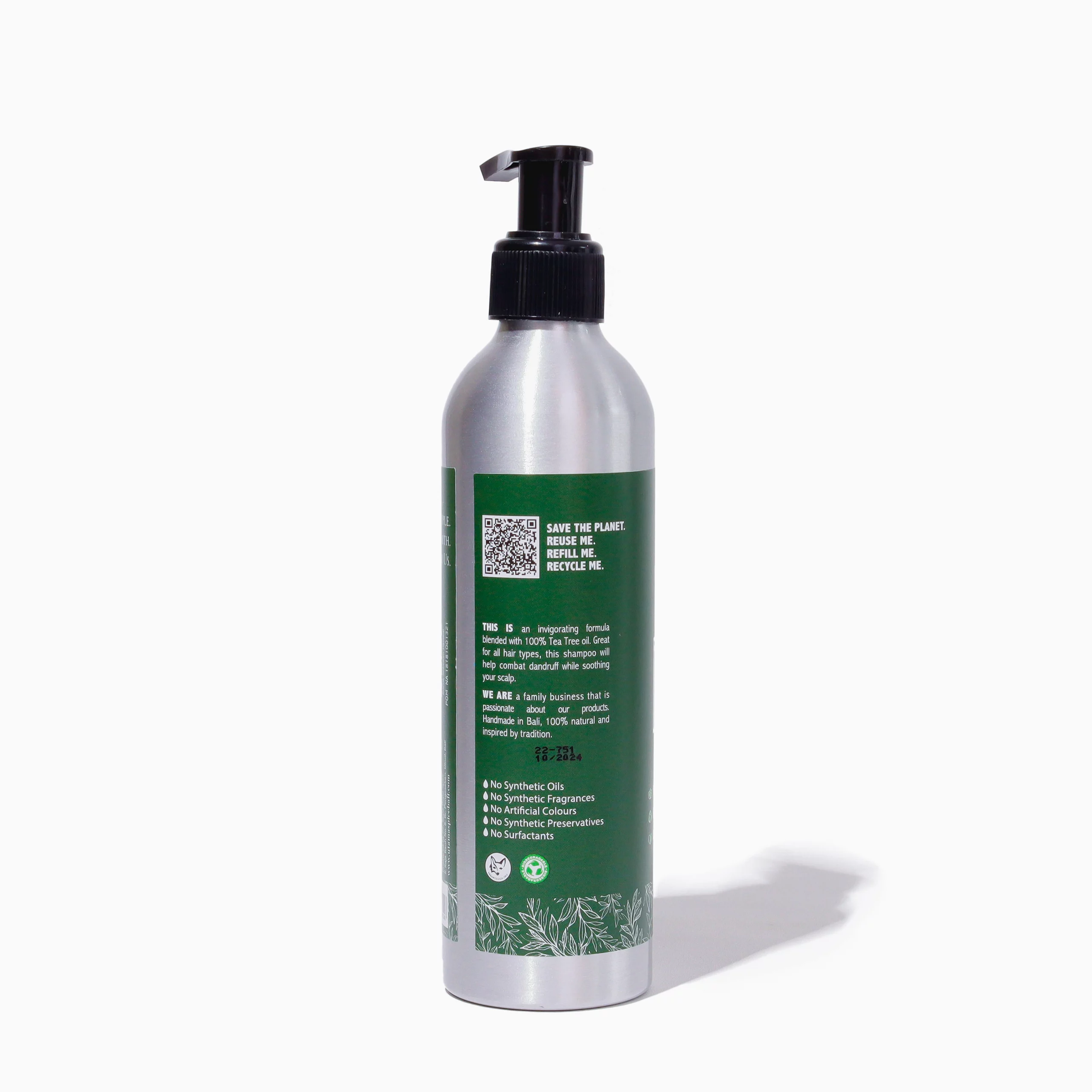 Shampoo Tea Tree menggunakan kemasan aluminium yang mudah untuk di daur ulang. Tea tree shampoo, membuat rambut direvitalisasi dan dipulihkan. Origanum dan mint menyediakan perlindungan anti mikroba dan sensasi sejuk penambahan tea tree oil merangsang kulit kepala dan membantu mencegah munculnya ketombe.